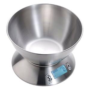 Graduation : 1 g Ecran LCD blanc rétroéclairé Fonctions thermomètre et minuteur Bol en acier inoxydable Dimensions : 21,5 x 14,5 cm